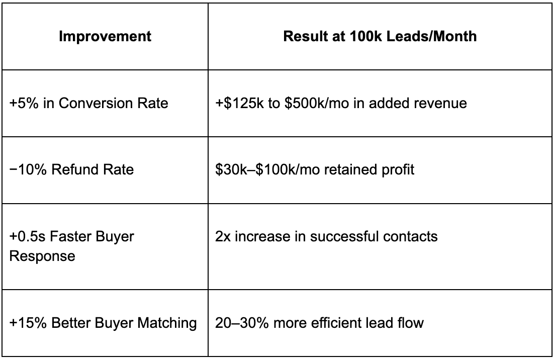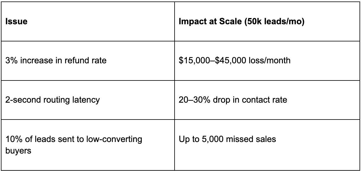 At small volumes, a few poor leads or a slow buyer response doesn’t move the needle. But once you scale to thousands of leads per day, every leak becomes a liability.